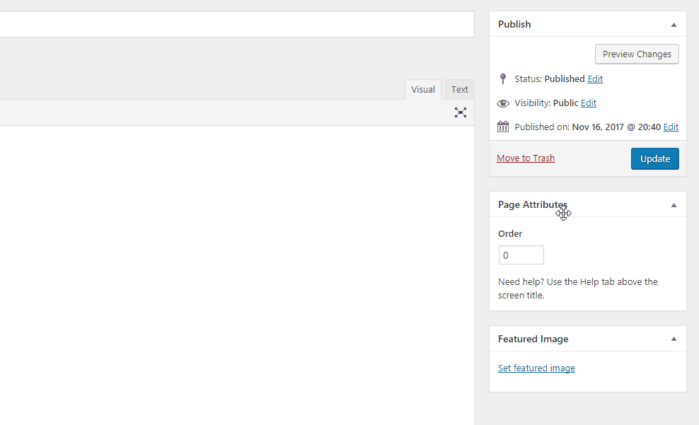 Undir „page attributes“ hægra megin á skjánum geturðu valið yfirflokk ef síðan þín á að vera undirsíða, eða valið númer hvað hún á að vera í röðinni í valmyndinni.