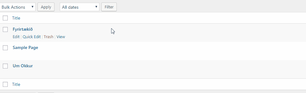 Líkt og með færslurnar geturðu hakað við margar síður í einu til að breyta ákveðnum atriðum eins og höfundi, hvort þær séu undirflokkur, leyft athugasemdir eða breytt stöðu þeirra.