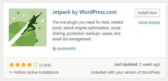 Önnur góð viðbót heitir „Jetpack“. Þú getur prófað að setja hana inn með því að smella á „install now“. Þá hleður WordPress-kerfið viðbótinni niður og bætir við síðuna þína. Mundu samt að smella á „activate“ til að virkja viðbótina.