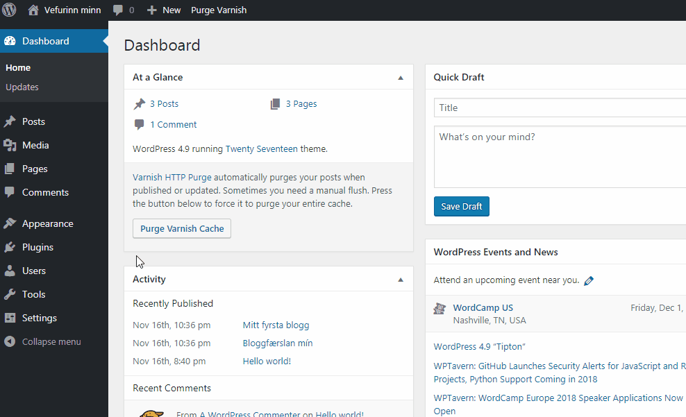 Undir „plugins” og „installed plugins“ sérðu hvaða viðbætur eru tengdar síðunni. Athugaðu að þær geta verið óvirkar þótt þær séu á listanum. Það er vegna þess að þú þarft að fara í gegnum tvö skref til að virkja viðbót. Fyrst þarftu að setja hana inn, og svo að virkja hana.