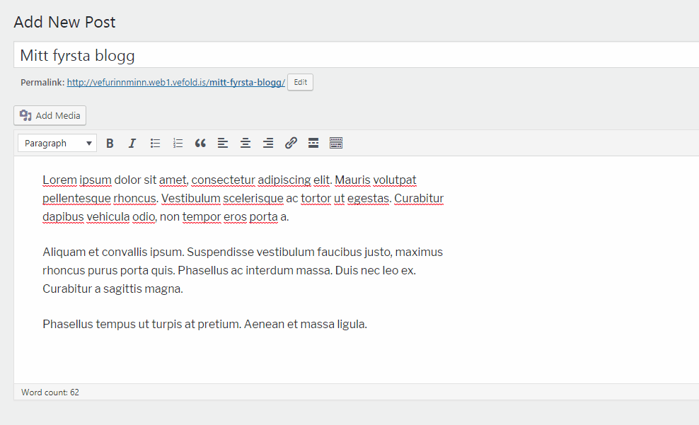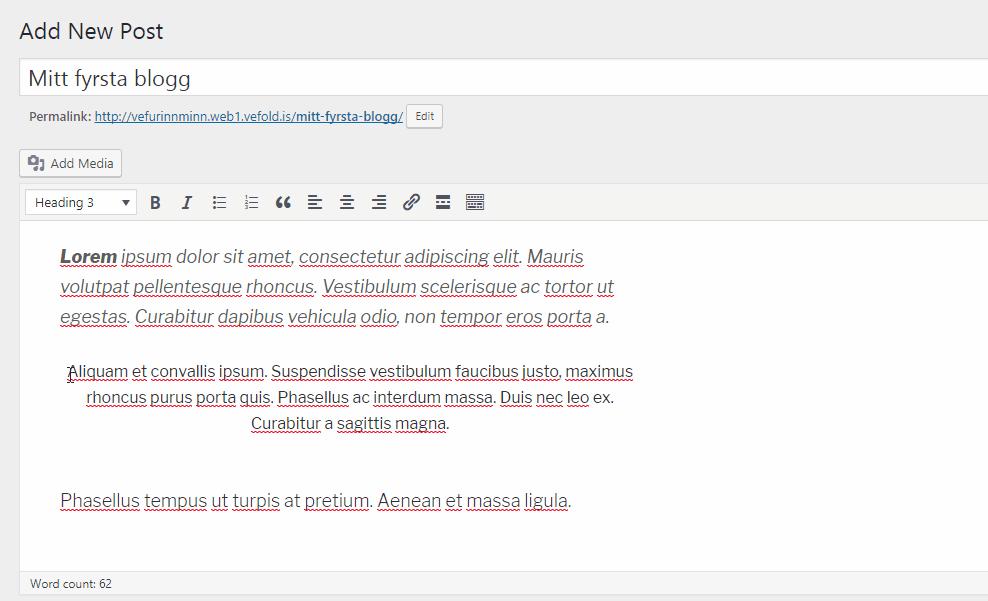 Næsti hluti námskeiðsins kennir þér að nota textavinnsluna í WordPress. Þegar þú ert að skrifa eða breyta færslum, síðum eða öðru efni í WordPress notarðu textavinnsluna (e. Editor).