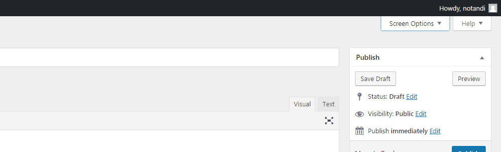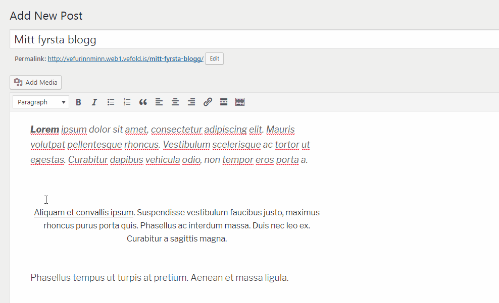Fyrir ofan hann eru tveir flipar. Annars vegar „visual“ og hins vegar „text“. Þú ert búin/n að vera að vinna í „visual“ ham hingað til. Ef þú smellir á „text“ færðu upp textavinnslu í kóðunarham (e. Code editor). Þar sérðu að WordPress-kerfið er sjálfkrafa búið að kóða textann fyrir þig í HTML svo vafrar birti hann rétt. Í stað aukavalmöguleikanna sem þú sást í „visual“ hlutanum færðu núna upp hnappa með kóðum. Ef þú kannt eitthvað fyrir þér í HTML geturðu leikið þér að því að vinna textann í „text“ ham, en fyrir byrjendur er best að halda sig við „visual“.
