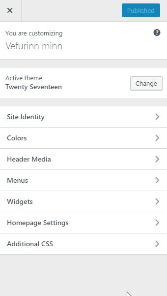 Ef þú kannt eitthvað fyrir þér í CSS geturðu valið „additional CSS“ í valmyndinni vinstra megin til að gera breytingar á útliti. Ef þú vilt vita meira um CSS geturðu smellt á litla spurningamerkið efst og fengið frekari upplýsingar.